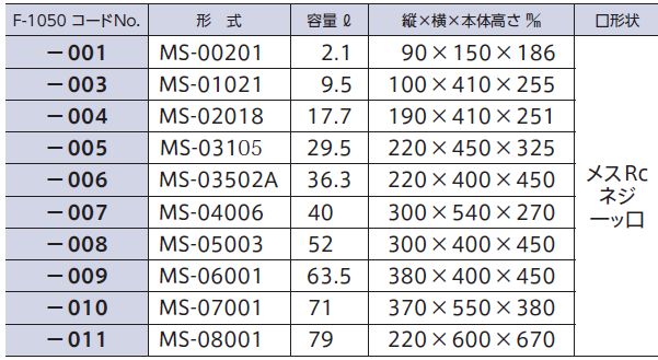 | F-1050-008 | PFA回転成型ボトル角型52.0L MS05003 | オープン価格 | 受注生産品 |