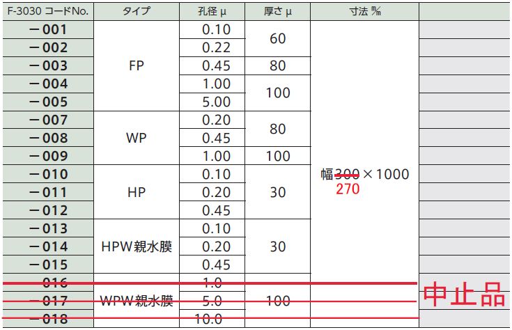 F-3030-003 PTFEメンブランフィルム FP-045 270×1000 45,600 52,500 0
