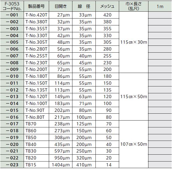 F-3053-023 | ポリエステルスクリーンTB15 目開1404μm 線径410μm 14メッシュ 巾107㎝ 1m | 5,700 | 6,600 | 通常9~12日間 |